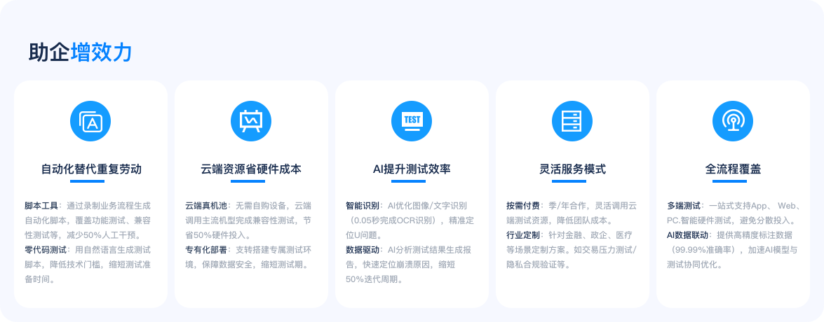 覆盖远程真机、自动化、众测与测试管理,以数据与流程驱动测试过程可视化、智能化