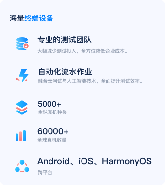 自动化测试帮助企业在短时间内执行大量重复性、多终端的测试任务,提供7x24小时服务,提高测试效率和生产力,消除手动执行的枯燥乏味,并确保应用程序在功能回归、兼容性、性能等方面的可靠性。