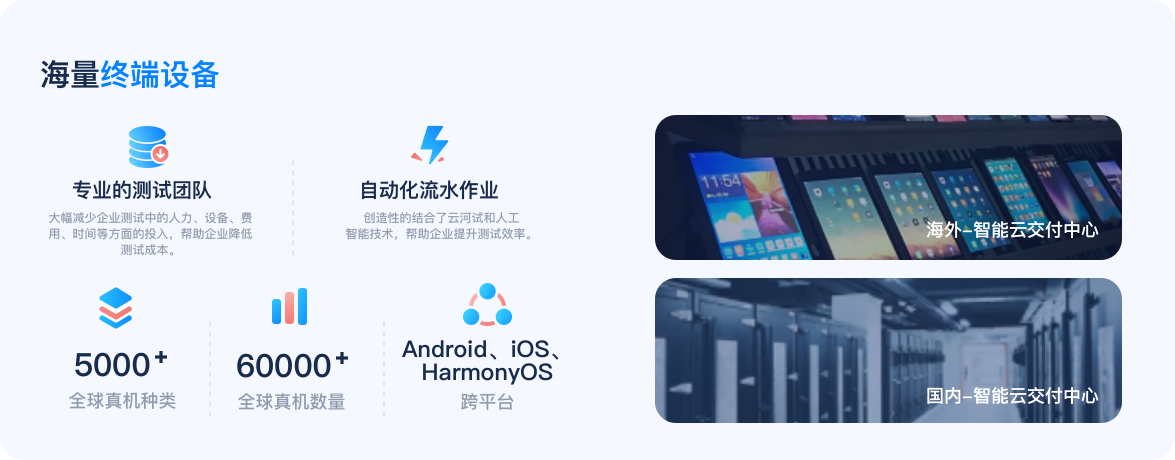 覆盖远程真机、自动化、众测与测试管理,以数据与流程驱动测试过程可视化、智能化