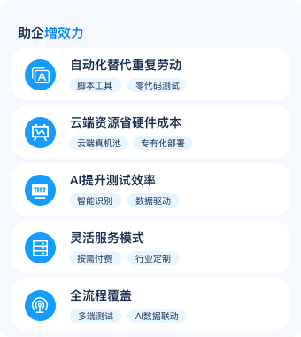 自动化测试帮助企业在短时间内执行大量重复性、多终端的测试任务,提供7x24小时服务,提高测试效率和生产力,消除手动执行的枯燥乏味,并确保应用程序在功能回归、兼容性、性能等方面的可靠性。
